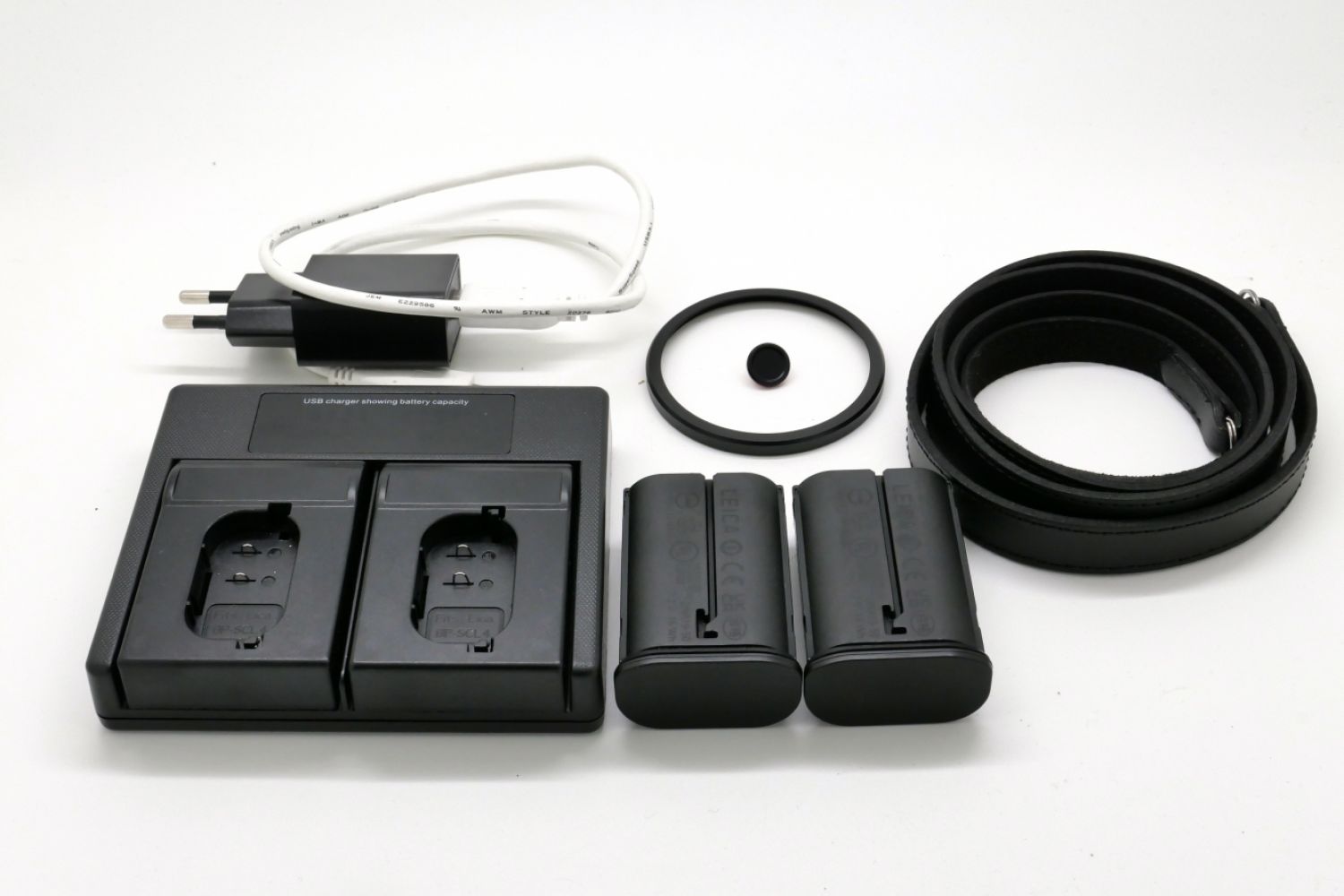 Vendu avec sa boite d'origine, 2 batteries, chargeur double non Leica, un bouton de déclenchement noir, son cache griffe, son bouchon de boitier et sa courroie.
